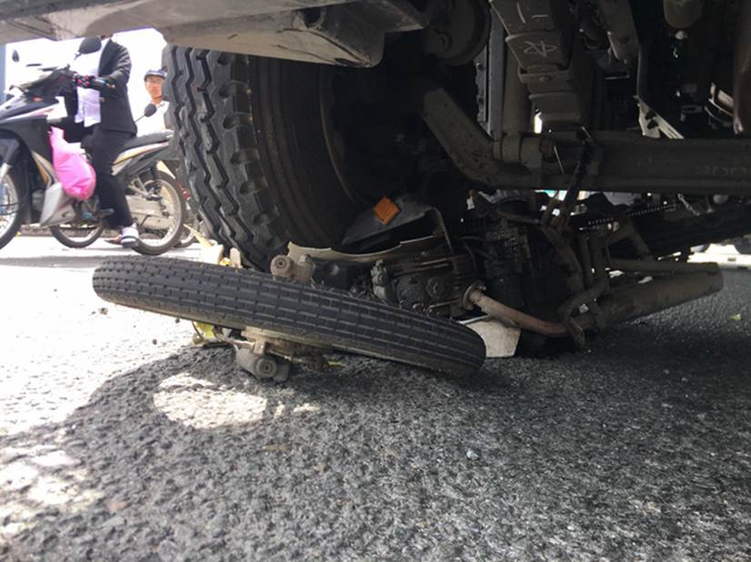 Vụ va chạm khiến xe máy bị xe tải cuốn vào gầm, kéo lên một đoạn rồi cán nát phương tiện này.
