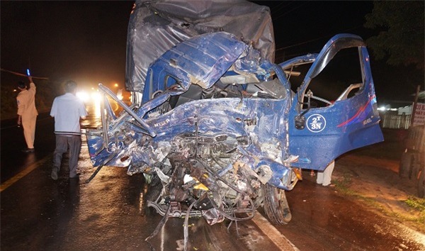 | Xe tải nát bét đầu sau cú tông trực diện xe khách |
