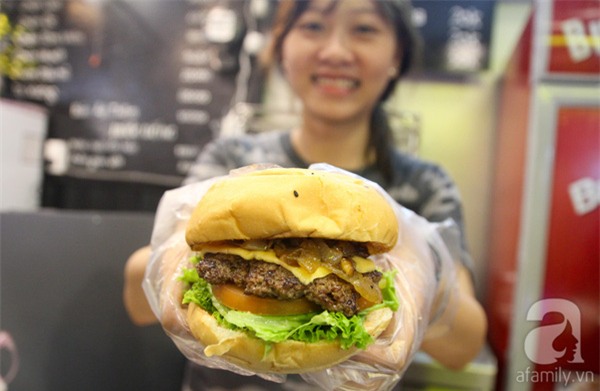 Món thức ăn nhanh của phương Tây như Hamburger loại to, đầy đủ nhân, rau sống, cà chua... được làm tại chỗ với giá 60 ngàn