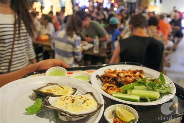Đủ các loại hải sản tươi sống được bày bán, chế biến theo nhiều hình thức nướng, hấp, tẩm bột, chiên...