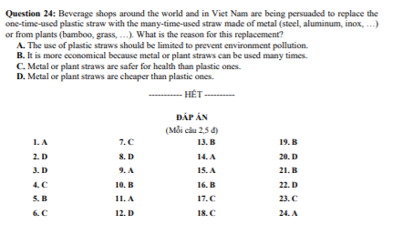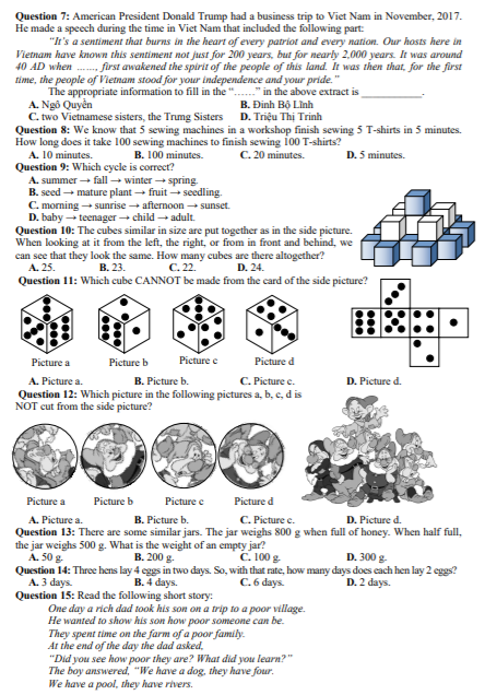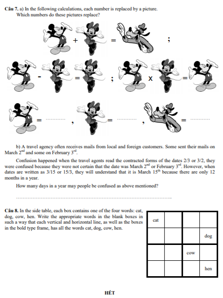 Bài khảo sát bằng tiếng Anh gồm 2 phần: Trắc nghiệm có 24 câu hỏi, tự luận có 8 câu hỏi, đề cập lĩnh vực toán học tư duy, toán thực tiễn, năng lực tiếng Anh, hiểu biết tự nhiên, khoa học thường thức.