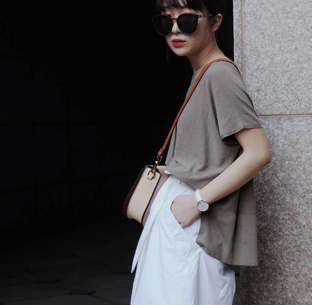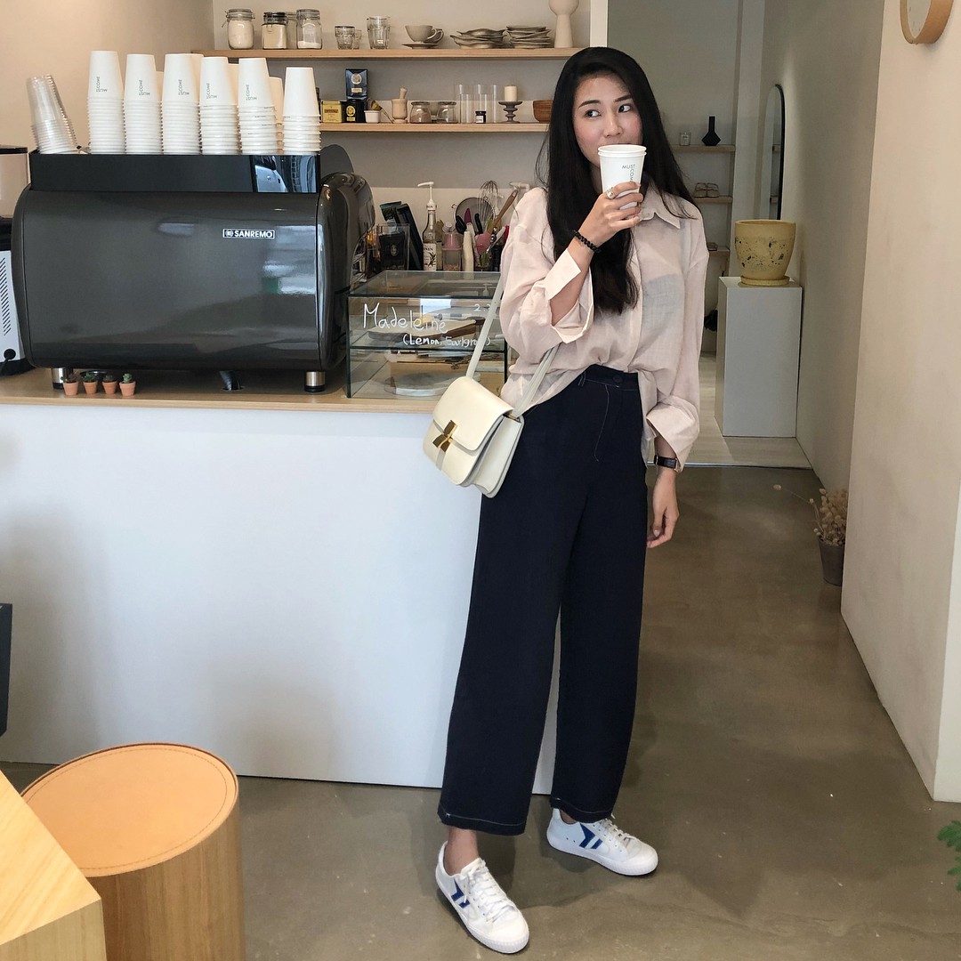 Hay như cô nàng này mang đến cách kết hợp cực đơn giản nhưng vẫn rất thu hút, sơ mi màu nude được kết hợp cùng quần culottes và giày thể thao trắng, cô nàng rất tinh tế khi chọn cho mình chiếc túi xách hợp tông với set đồ.