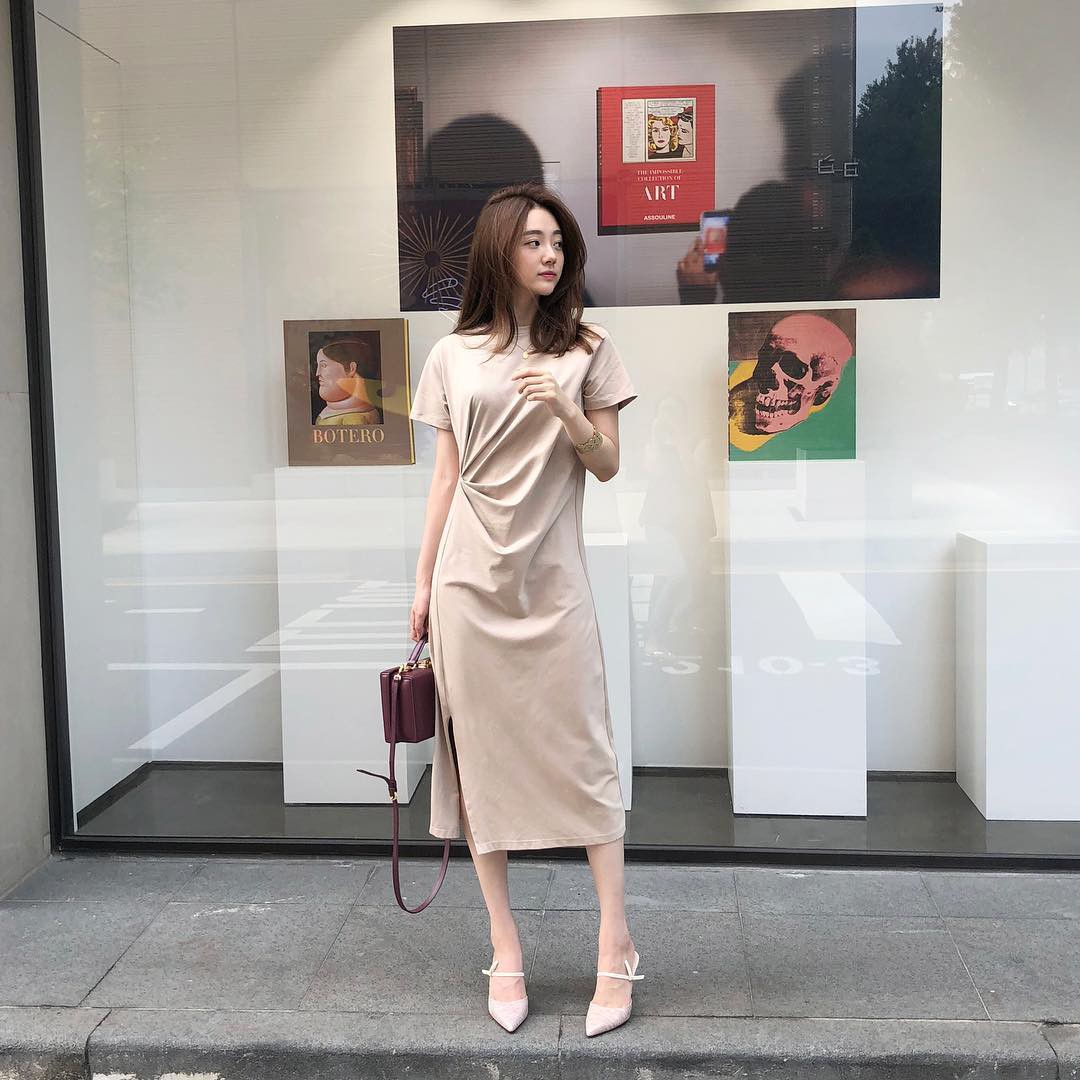 Đơn giản như cô nàng này khi chọn cho mình chiếc váy liền màu be có chi tiết "rúm eo" kết hợp cùng mules mũi chọn, và túi xách màu đỏ rượu nổi bật.