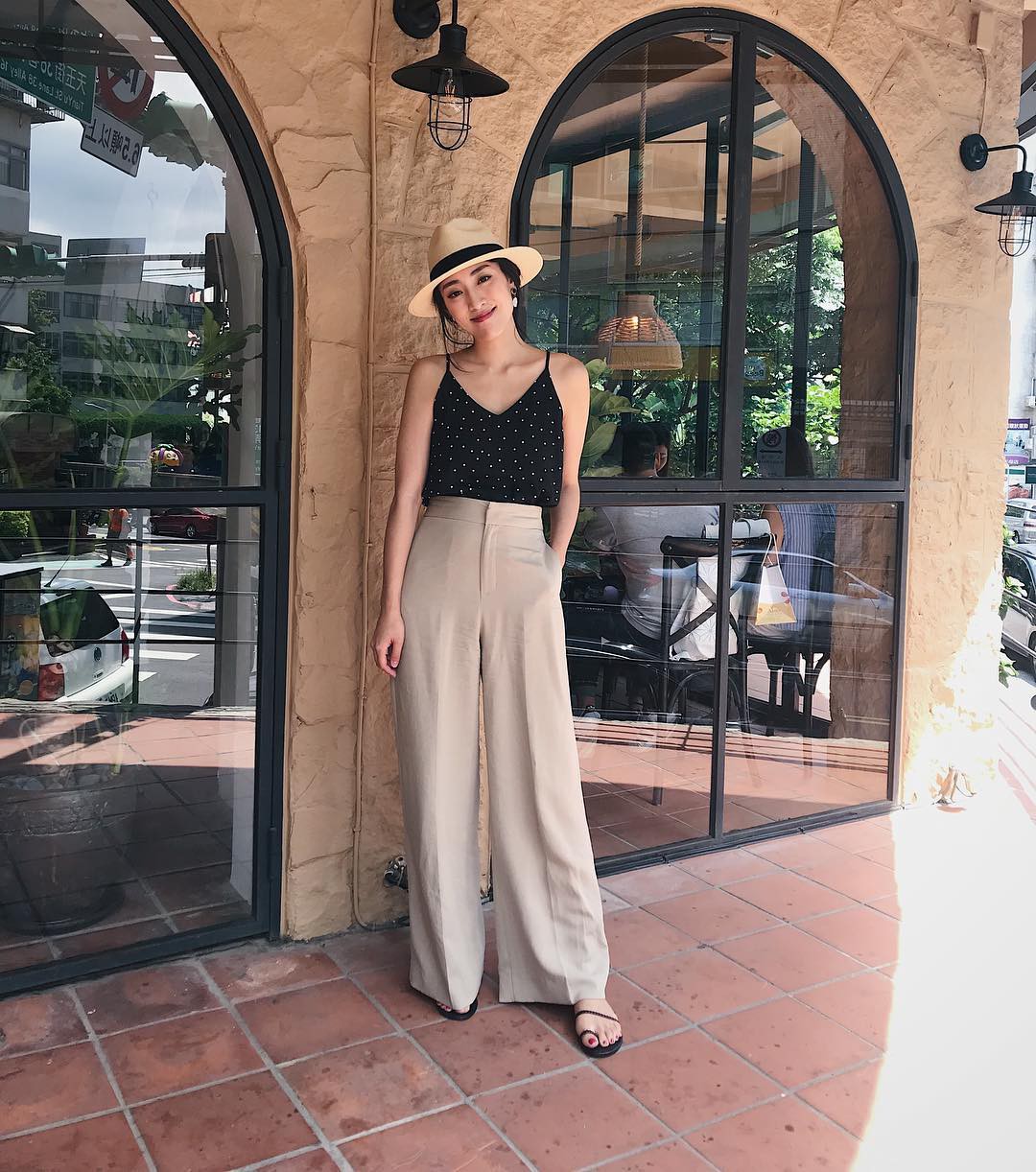 Set đồ của cô nàng này nhìn đơn giản nhưng lại có "sức mạnh" giúp kéo dài đôi chân, quần culottes cạp cao sơ vin cùng áo hai dây là combo vô cùng thoải mái mà các nàng có thể học theo.