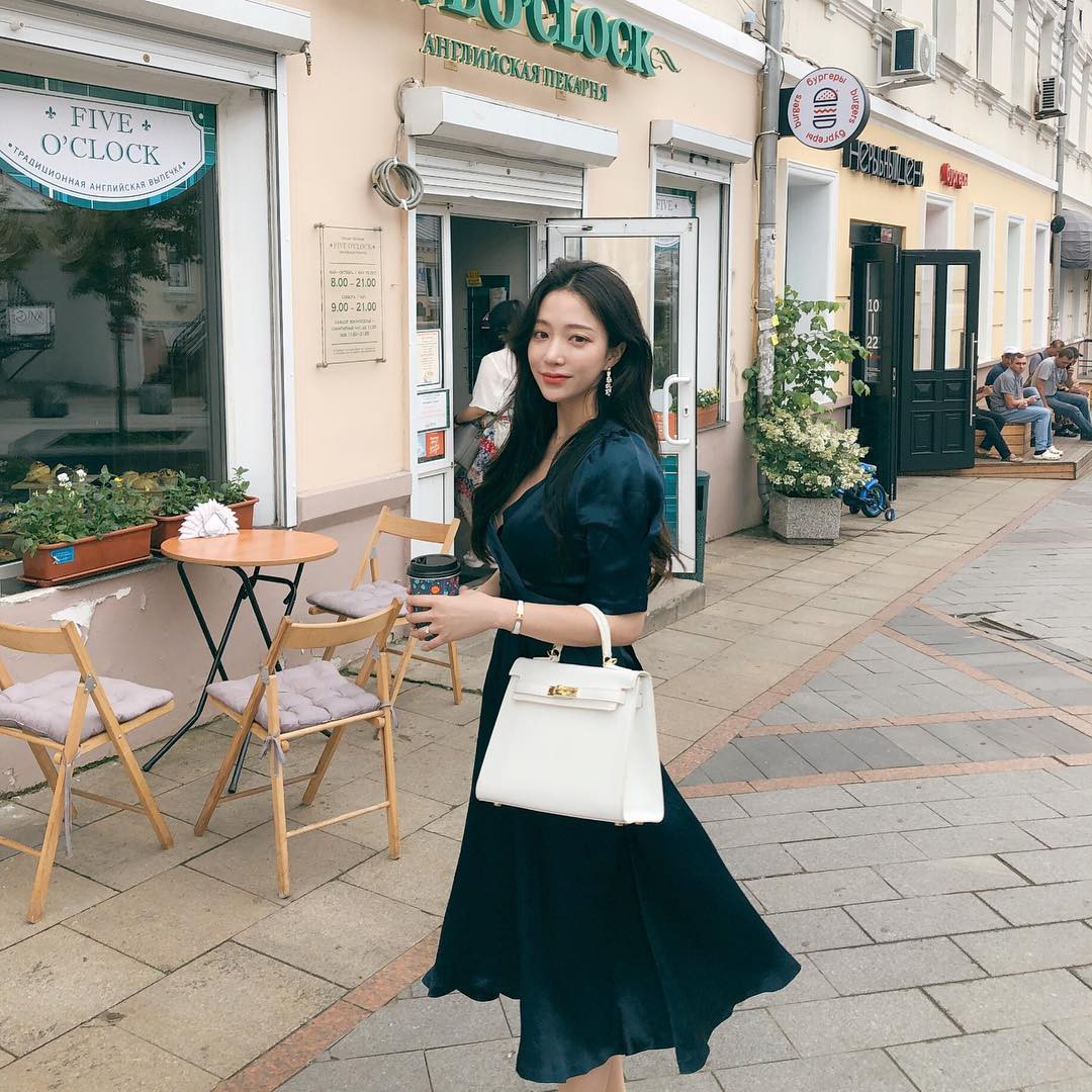 Điểm thu hút trong set đồ của cô nàng này chính là chiếc váy xòe tay bồng màu xanh cổ vịt, cô nàng đã có cách kết hợp chiếc váy cùng phụ kiện như vòng tay, khuyên tai và túi xách rất ăn ý.