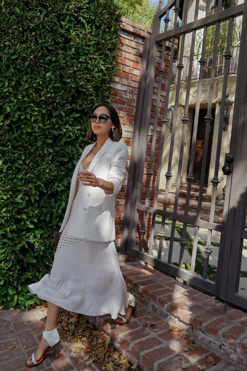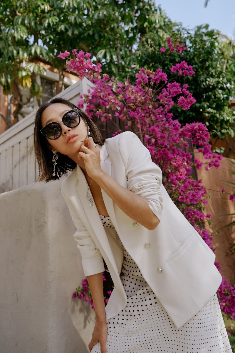 Những chiếc blazer không chỉ linh hoạt về kiểu dáng mà còn về cách kết hợp, bạn có thể kết hợp trẻ trung cùng áo phông quần jeans, hay chọn cách kết hợp thanh lịch trang nhã với váy liền như cô nàng này.