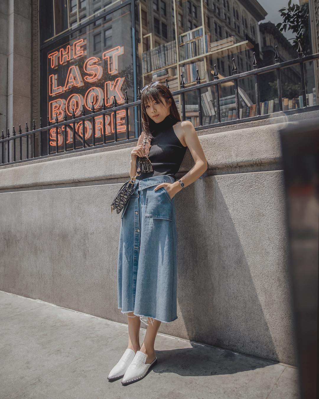 Áo len dệt kim cổ yếm được cô nàng này chọn cách kết hợp cùng chân váy denim khá ăn ý, điểm nhấn trong set đồ ngoài chiếc váy độc lạ còn nằm ở đôi mules mũi nhọn màu trắng.