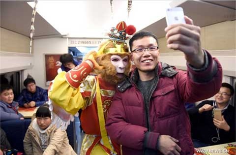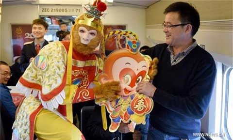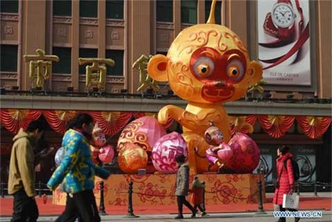 Trang trí mừng năm mới Bính Thân tại Bắc Kinh, Trung Quốc. Tôn Ngộ Không tặng quà và chụp ảnh tự sướng cùng các khách đi tàu tại Trung Quốc Mua đồ trang trí Tết ở Trung Quốc |