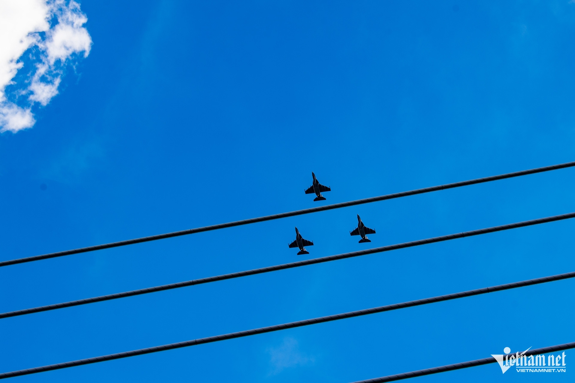 Khoảng 9h10, biên đội 10 chiếc trực thăng bay theo đội hình 3-4-3 bắt đầu xuất hiện trên bầu trời TPHCM sau khi cất cánh từ sân bay Biên Hòa (Đồng Nai). Ảnh: Hoàng Hà.