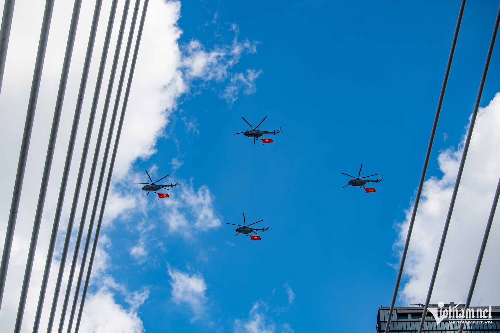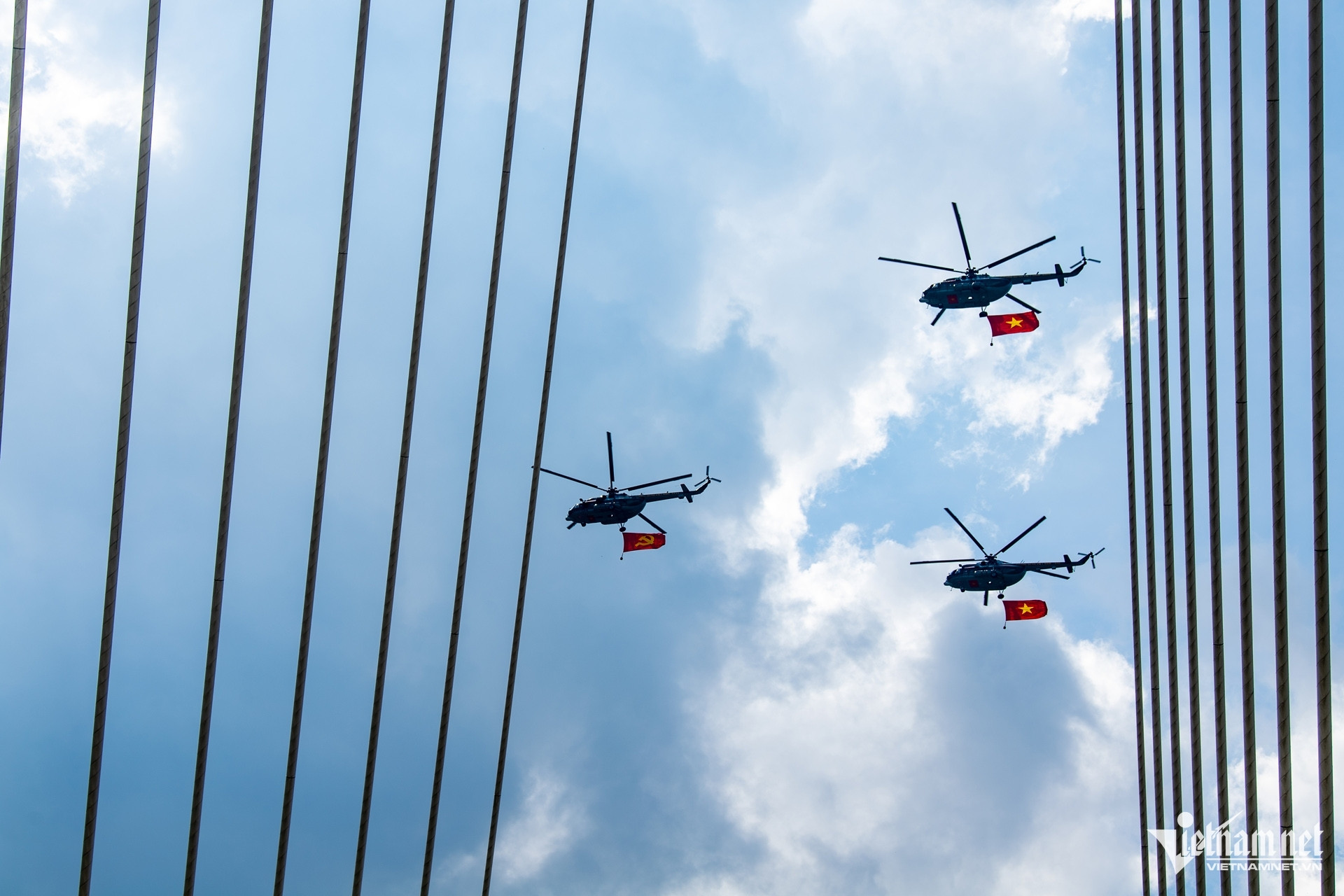 Phi đội trực thăng Mi-171, Mi-8, Mi-17 trong đội hình bay treo cờ dịp lễ này từng tham gia trình diễn tại những sự kiện lớn như lễ kỷ niệm 70 năm Chiến thắng Điện Biên Phủ, khai mạc Triển lãm Quốc phòng quốc tế Việt Nam 2024. Ảnh: Nguyễn Huế.