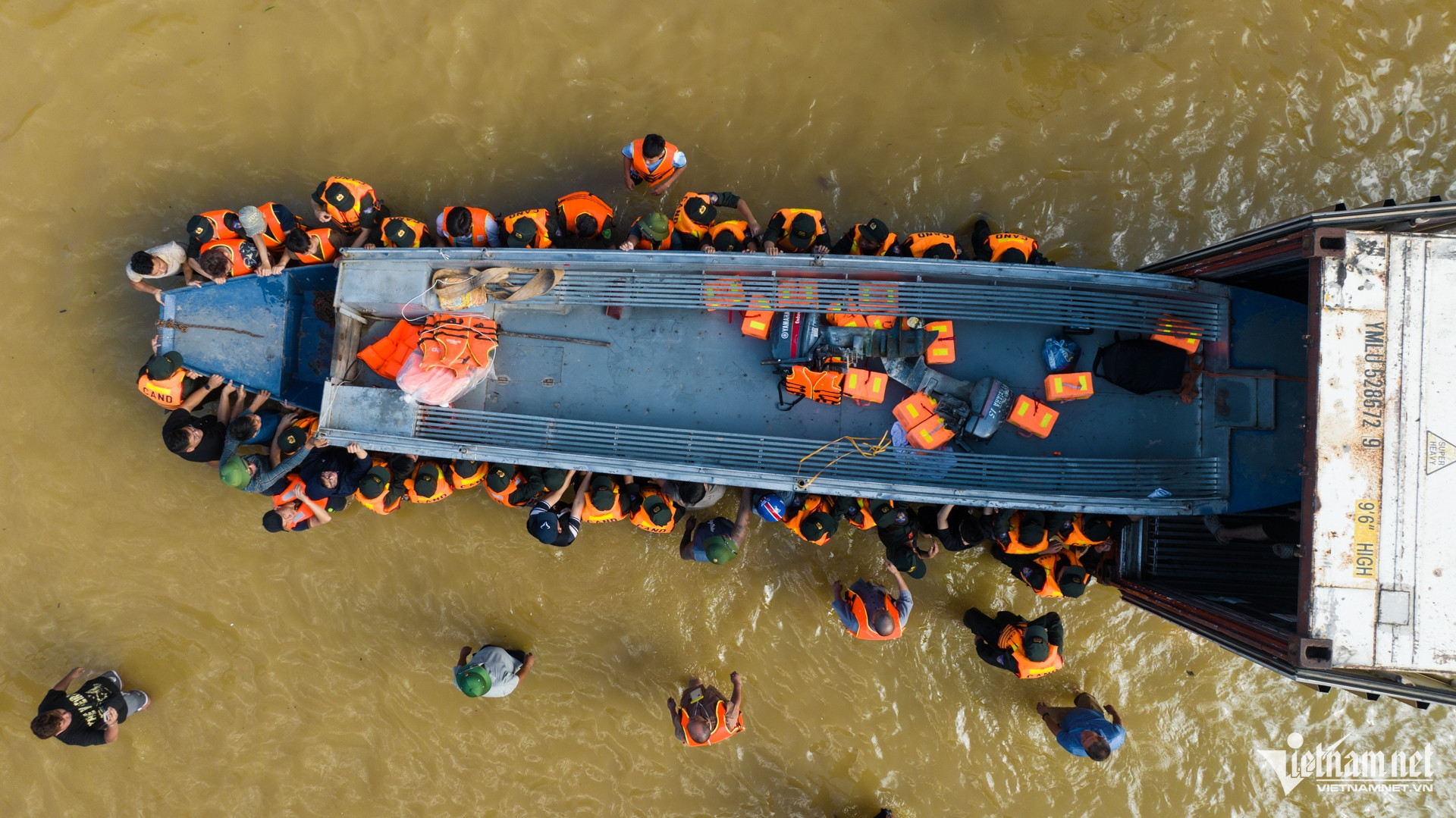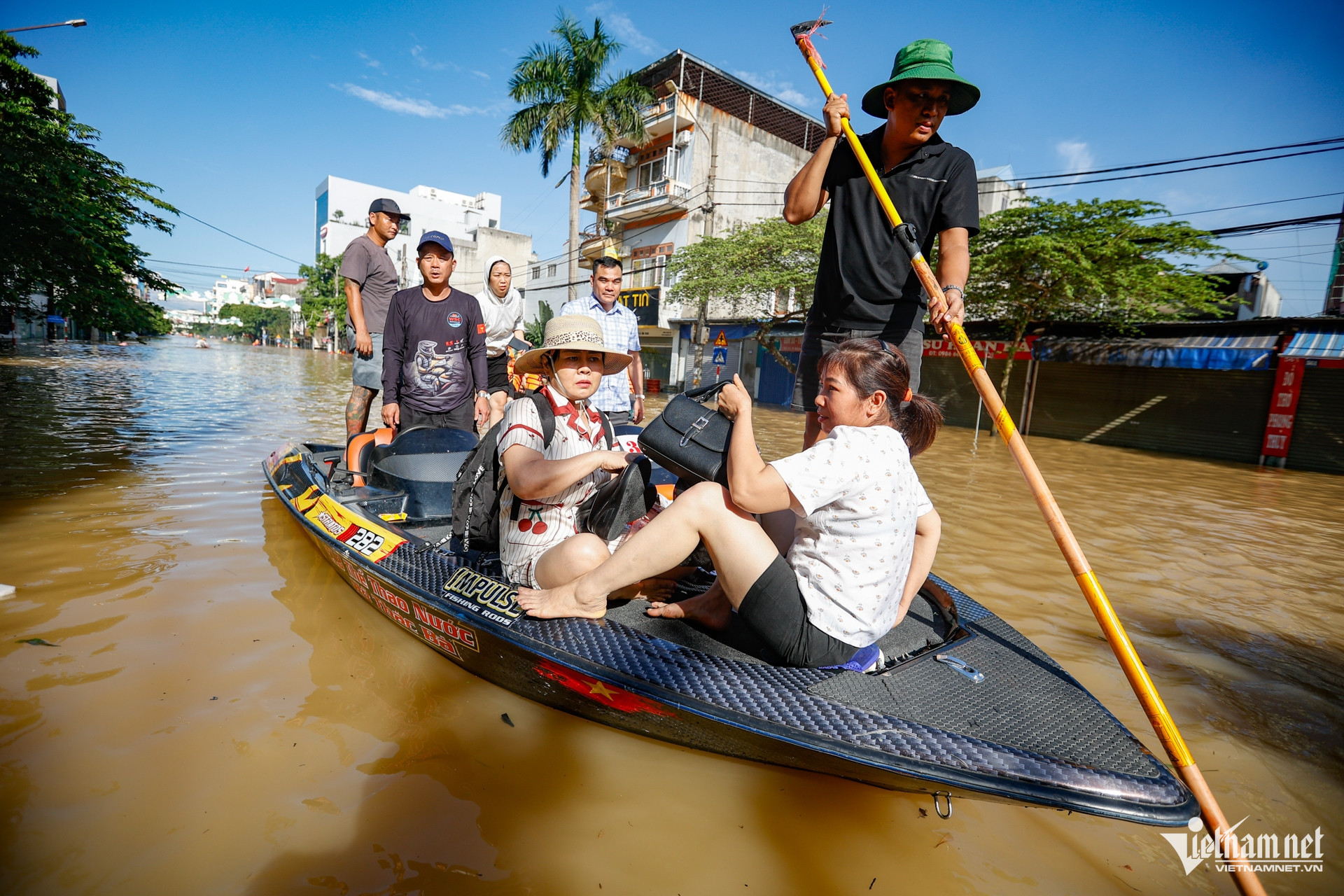 16h, lực lượng cứu hộ vận chuyển thêm một thuyền lớn, có thể di chuyển vào các khu vực nguy hiểm để đưa người dân ra ngoài. Tuy nhiên, các điểm ngập không đồng đều, bà con lại đặt ra bài toán làm sao để thuyền có thể di chuyển an toàn, tránh được vật cản hoặc khu vực nước cạn.