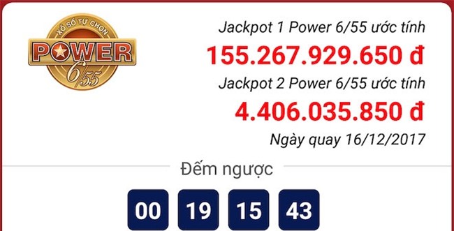 Hiện, jackpot 1 của Power 6/55 đang ở mức hơn 155 tỉ đồng, và dự báo sẽ vượt 160 tỉ đồng ngay sau kỳ quay 061 (mở thưởng tối 19/12). Trước đó, kỷ lục giá trị jackpot là hơn 159 tỉ thuộc về chương trình Mega 6/45.