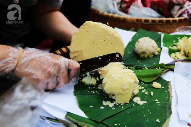 Điểm đặc biệt của quán xôi cô Tuyết là nắm đỗ xanh "khổng lồ". Nhìn nắm đỗ xanh to giã mịn, vo chắc tay, thái lát mềm mỏng thế này, chưa ăn đã cảm thấy "đã".