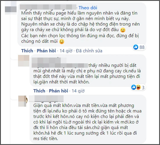 Tuy vậy, một số ý kiến khác cho rằng đây hoàn toàn không phải là hiện trường của một vụ đánh ghen. Chiếc xe bị cháy vì lí do khác chứ không phải do người vợ "xử lý" chồng như trong các bài đăng đang được lan truyền trên mạng xã hội.