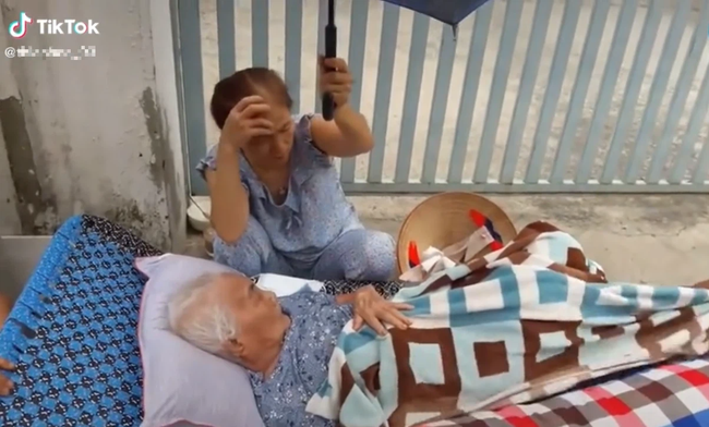 Cụ bà phải ra góc đường nằm giữa trời nắng, hàng xóm thương nên đã ra che ô, quạt mát cho cụ