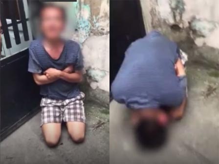 Một thanh niên cầm cán chổi liên tục chỉ vào mặt người đàn ông tra hỏi, "mày vào đây mấy lần rồi?". Người đàn ông ngồi thụp xuống, liên tục ôm đầu mếu máo, "Anh tha cho em, công an đến bắt em đi tù thì chết", đồng thời khoanh tay, quỳ gối cúi rạp người xuống xin tha.