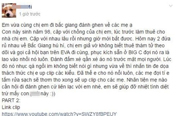 “Em vừa cùng chị em đi Bắc Giang đánh ghen về các mẹ ạ. Con này sinh năm 98, cặp với chồng của chị em, lúc trước làm thuê cho nhà chị em. Cặp với nhau lâu rồi nhưng giờ mới bắt được. Hôm nay 2 đứa rủ nhau về Bắc Giang hú hí, chị em giả vờ không biết thuê thám tử theo dõi và gọi cả hội bạn trên EVA đi cùng, phục kích sẵn ở Big C đợi nó ra là lao vào xxx nó luôn. Đánh đấm xé quần xé áo nó trước mặt mọi người".