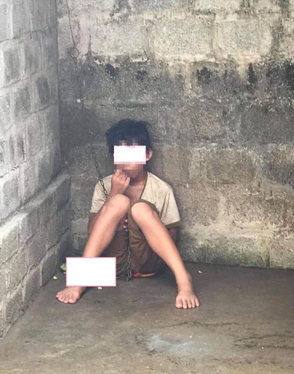Hình ảnh cậu bé bị bố trói xích tại một góc nhà.