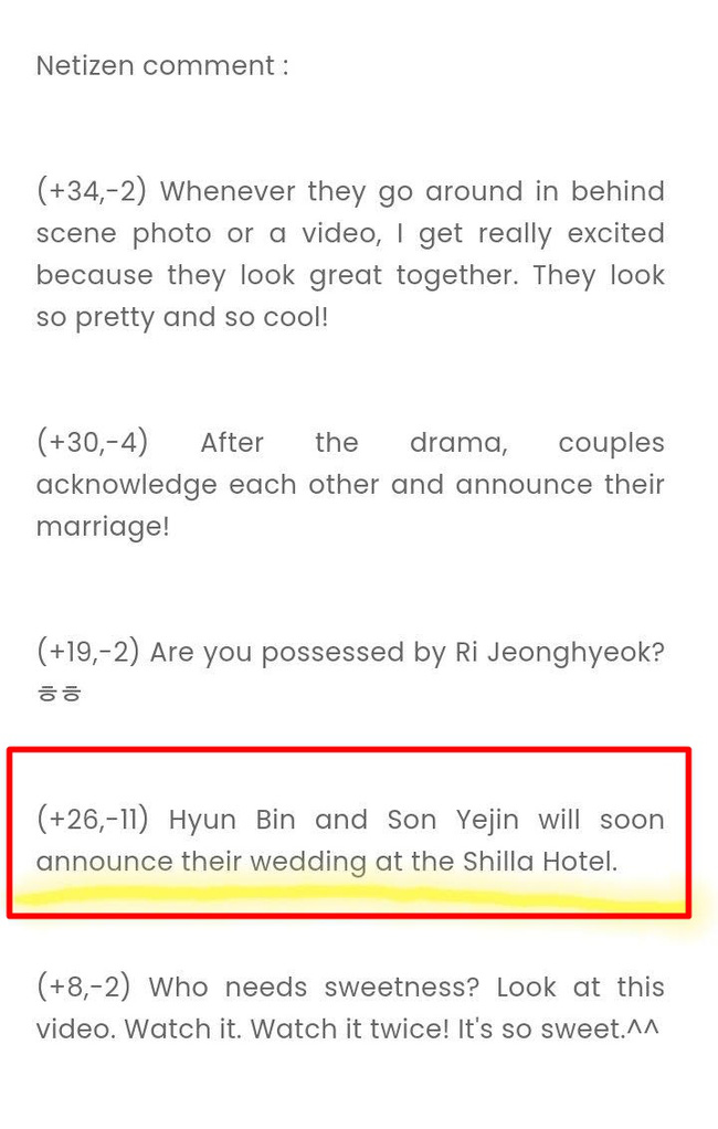 Ngay khi thông tin này được tiết lộ trên chương trình của đài POP FM 91.7, cộng đồng mạng đã "rần rần" chia sẻ và bình luận về cặp đôi khắp các diễn đàn. Đáng chú ý, trong số những bình luận thể hiện sự phấn khích, vui mừng khi Son Ye Jin và Hyun Bin được cho là đang hẹn hò thì có một bình luận được netizen lan truyền rộng rãi. Đó là bình luận nói về đám cưới của cặp đôi "Hạ cánh nơi anh".