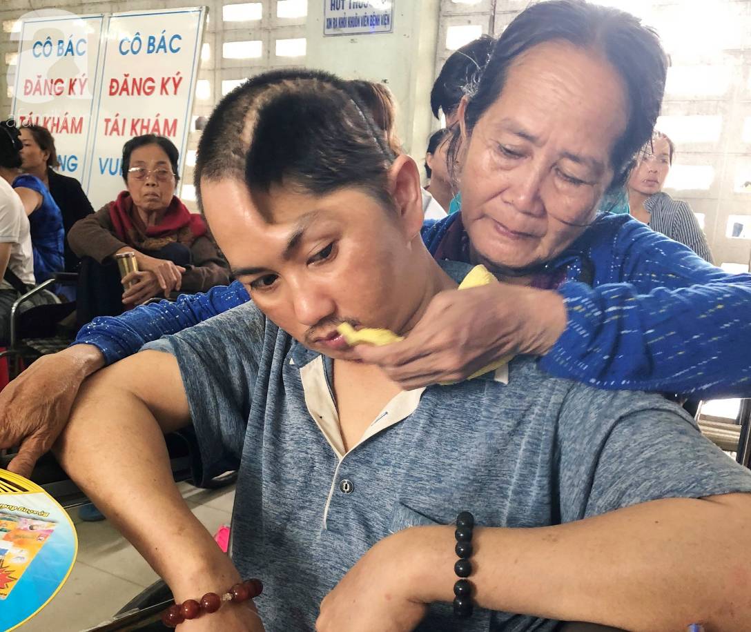 Ngồi một góc lặng lẽ trước dãy hành lang của bệnh viện, bà Cúc cố nheo đôi mắt mờ của mình, vỗ vỗ đôi bàn tay động viên. Cách đó vài bước chân, anh Thanh cố chập chững bước đi, vừa ê a gọi mẹ rồi cười tít mắt. Dù đã 33 tuổi nhưng anh Thanh chẳng khác gì một đứa con nít, nhưng với bà Cúc, việc được nhìn thấy con trai hồi phục mỗi ngày đã là điều hạnh phúc nhất đối với bà.