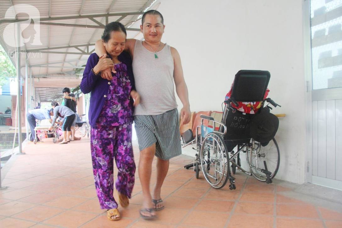 Góc bệnh viện, bà Cúc vẫn từng ngày tập vật lý cùng đứa con trai khờ của mình.