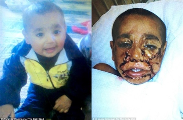 Hình ảnh Mohamad trước và sau vụ công kích. Cậu bé bị kẹt trong đống đổ nát, khuôn mặt bỏng nặng, đầy máu.