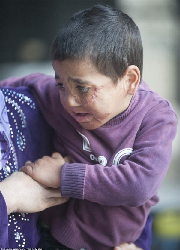 “Khi tôi nhìn thấy bé sau vụ nổ, người thằng bé đầy các mảnh vỡ. Tôi chỉ nhìn thấy đôi mắt con tôi. Khi tôi rửa mặt, tôi nhận ra da mặt bé chảy ra, đặc biệt là xung quanh mắt trái.” – Cô Aziza, mẹ của Mohamad kể lại.