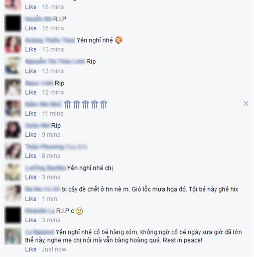 "Nó là bạn cấp 3 của em. Nó nghịch lắm. Giờ nó mất rồi. Ai pha trò trong lúc họp lớp đây" - L. chia sẻ. "Thương bạn ấy quá, mong bạn yên nghỉ" - một facebook-er bày tỏ. Một người có nickname Q.N. cũng chia sẻ: "Chị này học cấp 3 với mình. Khổ thân mới 21 tuổi xinh gái, tình yêu đẹp mà phải đi, thương quá".