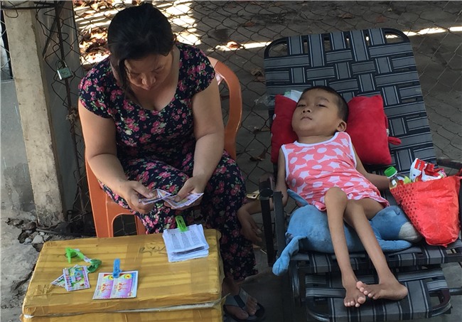 | Chân khập khiễng chị Nguyệt bế Quí ra nơi bán vé số |