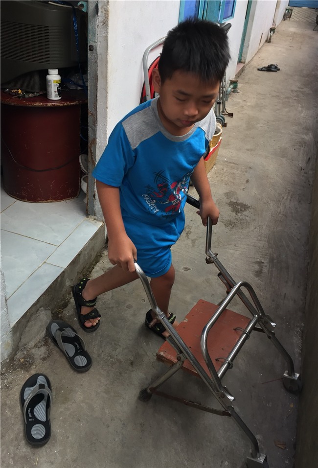 "Thằng Đạt ra kìa", chị chỉ tay về phía xa. Một bé trai 2 chân khẳng khiu phải tựa vào chiếc xe đẩy. Đôi chân dứng không vững nhưng nhờ có chiếc xe, thằng bé từng bước đi về phía mẹ. Đạt leo lên ghế ngồi cạnh em. "Con có đi học không ?", tôi hỏi. "Dạ có. Con học lớp 1 trường Vĩnh Hội. Hàng ngày mẹ chở con đi", Đạt nói.