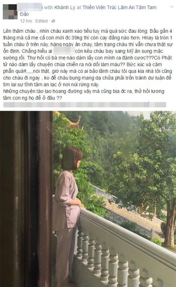 Theo chia sẻ của cô Khánh Ly, hiện tại dù mang bầu gần 4 tháng song cả hai mẹ con nữ diễn viên mới chỉ nặng được 39kg. Sau tròn 1 tuần lưu lại Thiền Viện Trúc Lâm, tâm trạng của Khánh Ly vẫn chưa thật sự ổn định dù mỗi ngày cô đều ăn chay niệm Phật.