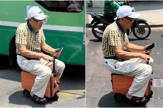 Theo đó, gần đây mạng xã hội chia sẻ clip ông ZX.T. cưỡi vali di chuyển trên các tuyến đường Nguyễn Huệ, Lê Thánh Tôn… ở quận 1, vào sáng 20/3.