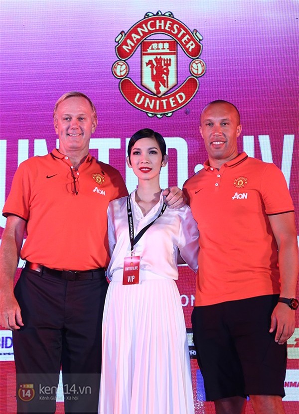 Xuân Lan tỏ ra rất thích thú khi được đứng cạnh các cựu cầu thủ của M.U