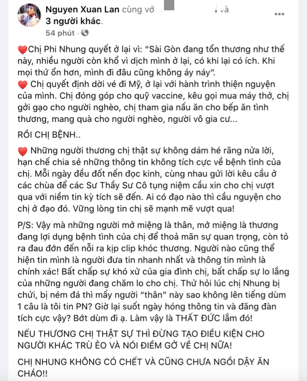 Sau tất cả, nữ siêu mẫu khẩn thiết mong người ngoài đừng chia sẻ những thông tin tiêu cực để tránh gây xôn xao dư luận trong lúc Phi Nhung đang chiến đấu với bệnh tật. "Nếu thật sự thương chị, đừng tạo điều kiện cho những người khác trù ẻo và nói điềm gở về chị nữa", Xuân Lan "cảnh báo".
