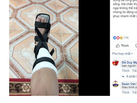 Xuân Mạnh đã có thể rời khỏi giường bệnh và đi lại với sự trợ giúp của đôi nạng. Ảnh: All About U23