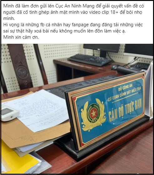 Trên trang cá nhân, Trâm Anh cập nhật: "Mình đã làm đơn gửi lên Cục An Ninh Mạng để giải quyết vấn đề có người đã cố tình ghép ảnh mặt mình vào video clip 18+ để bôi nhọ mình.