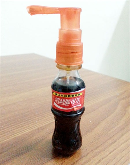 Theo quan sát của PV, chai nước Coca-cola chỉ nhỏ xíu như ngón tay, hình dạng khá giống với những chai nước giải khát Coca-cola thông thường nhưng có thêm vòi bơm và dài khoảng chừng 15cm. Màu nước bên trong chai cũng giống với màu nước giải khát Coca-cola.