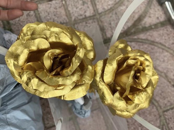 Một người bán hơn 200 cành hồng mạ vàng siêu rẻ (Gia Lâm, Hà Nội) cho biết, hoa được mạ vàng 24K bằng công nghệ chuyên nghiệp, chế tác tỉ mỉ. Các đường nét uốn lượn mềm mại, tự nhiên như bông hồng thật. Sản phẩm hoàn chỉnh là cành hoa kích thước 25x8cm, tặng kèm túi đựng.