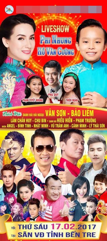 Poster chương trình Phi Nhung và các con nuôi tham gia vào ngày 17/2/2017 (tức ngày 21/1 âm lịch) tại tỉnh Bến Tre