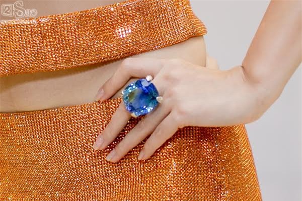 Phụ kiện là chiếc nhẫn đá to bản màu xanh coban và đôi sandal ánh bạc ton-sur-ton.