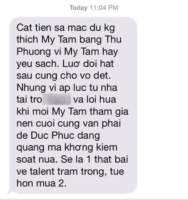 Tin nhắn nặc danh có nội dung: “Cát Tiên Sa (đơn vị tổ chức The Voice) mặc dù không thích Mỹ Tâm bằng Thu Phương vì Mỹ Tâm hay yêu sách, luôn đòi hát sau cùng cho “vơ đét”.