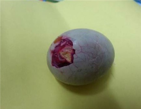 Tuy nhiên, khi đập vỏ, gia đình anh rất hốt hoảng vì tòan bộ lòng trắng của quả trứng được thay thế bằng một màu đỏ, ướt hơn lòng trắng thông thường. Lòng đỏ vẫn giữ nguyên màu. Trứng không có mùi bất thường, nhưng do nghi ngờ đây là trứng giả hoặc trứng có độc, gia đình đã không dám ăn mà gói và bảo quản trong tủ lạnh.