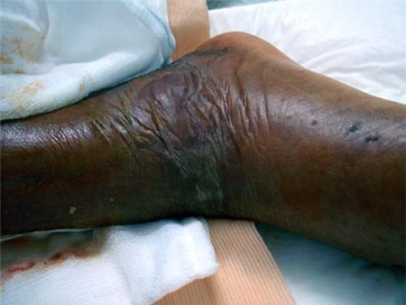 Đến ngày 15/5, bà Jũng nhập viện trong tình trạng sốc nhiễm trùng nặng, viêm hoại tử lan tỏa từ khớp gối xuống hết bàn chân phải, toàn bộ cẳng chân phải sưng nề, da đổi màu tím như quả sim, cẳng chân sưng đau, bệnh nhân kêu la dữ dội.