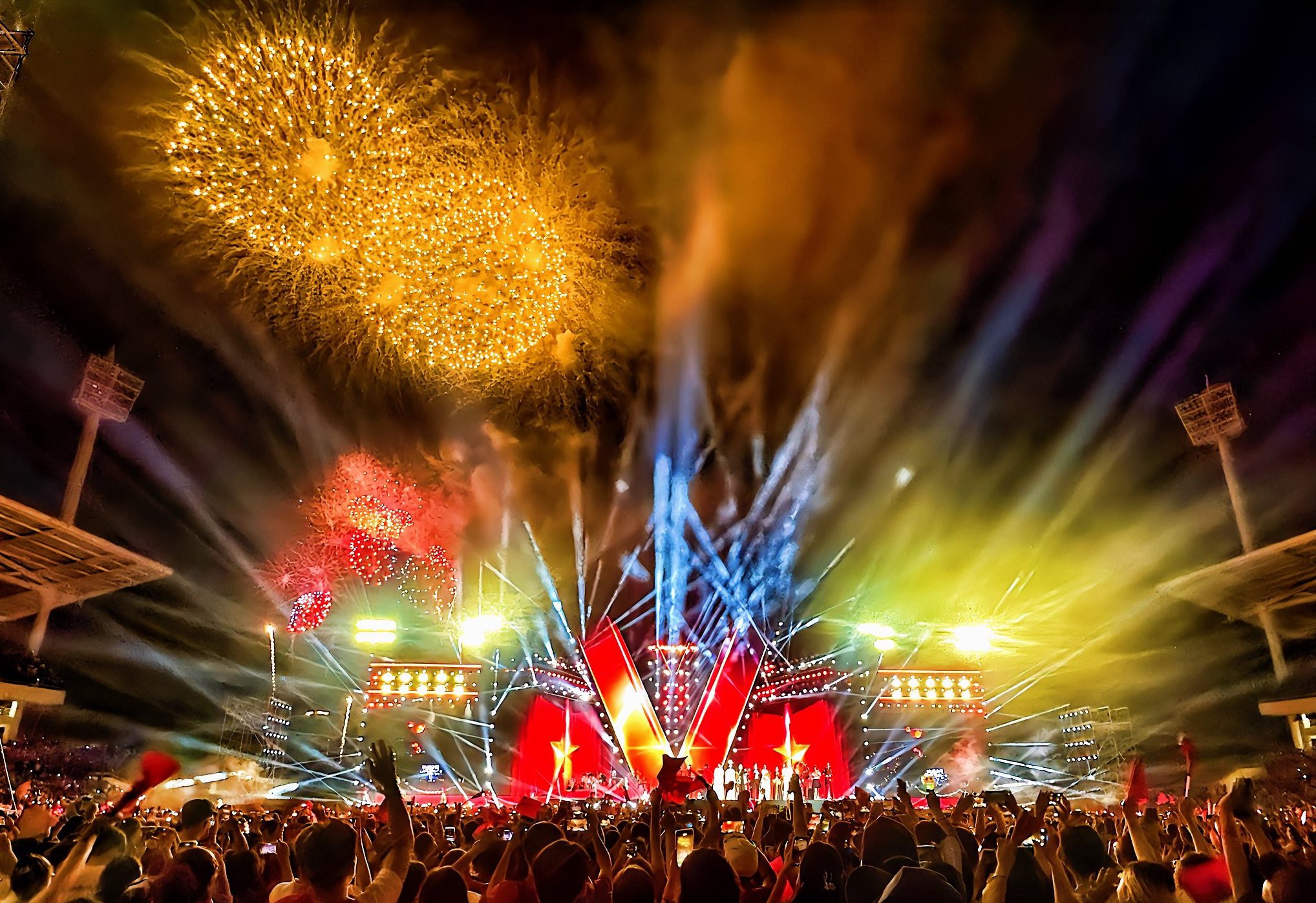 Khoảnh khắc hơn 50.000 người đồng thanh hát Quốc ca dưới lá cờ Tổ quốc trong concert mừng 80 năm Cách mạng Tháng Tám và Quốc khánh 2/9.