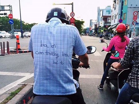 Hình ảnh tấm lưng áo của một người đàn ông đi xe máy trên đường với dòng chữ "Ba ơi, con thương ba. Bé Ti" ở sau lưng siêu dễ thương đang được rất nhiều người chia sẻ.