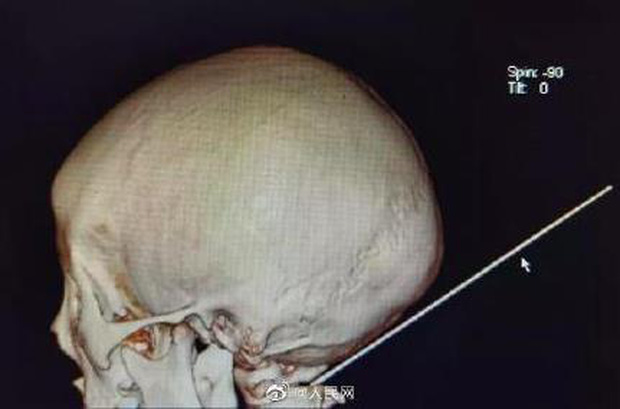 Từ bên ngoài nhìn vào, có thể thấy chiếc bút chì đã cắm được già nửa vào đầu cậu bé.