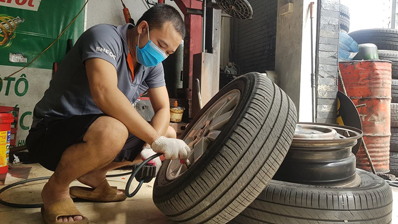 Cửa hàng lốp ô tô Minh Phú tất bật vá lốp, bơm hơi ngay từ 10 giờ sáng