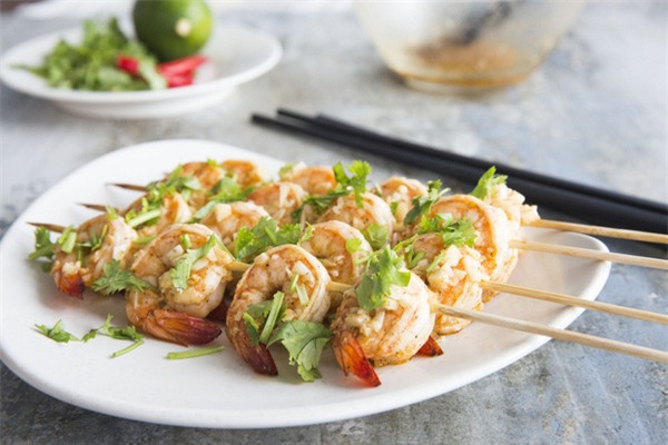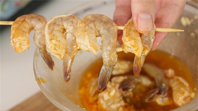 Vớt tôm ra khỏi bát hỗn hợp, xiên vào que, mỗi xiên bạn chỉ để khoảng 3 – 4 con tôm là vừa. Phần nước ướp còn dư, bạn không bỏ đi mà để tiếp tục quết lên mình tôm trong quá trình nướng. |