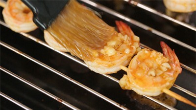 ![]() | ![]() Lần lượt xếp xiên tôm vào khay, nướng trong 3-4 phút cho đến khi tôm ngả màu vàng nâu. |