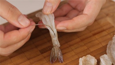 Tôm lột vỏ, bỏ đầu nhưng giữ lại phần đuôi, sau đó rạch lưng tôm rút chỉ đen. |